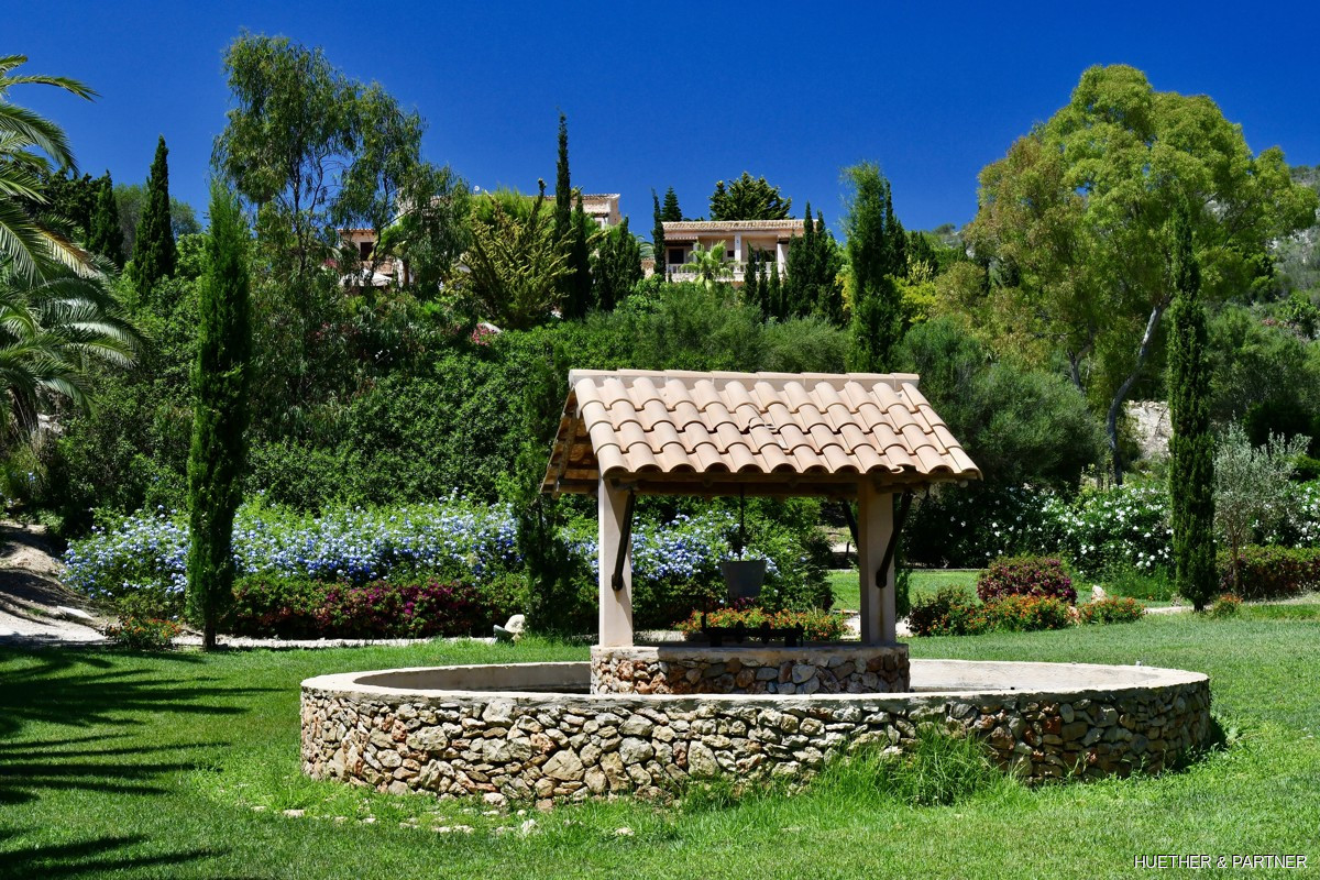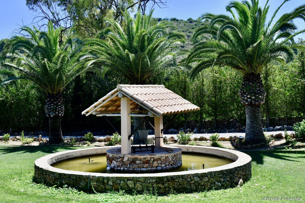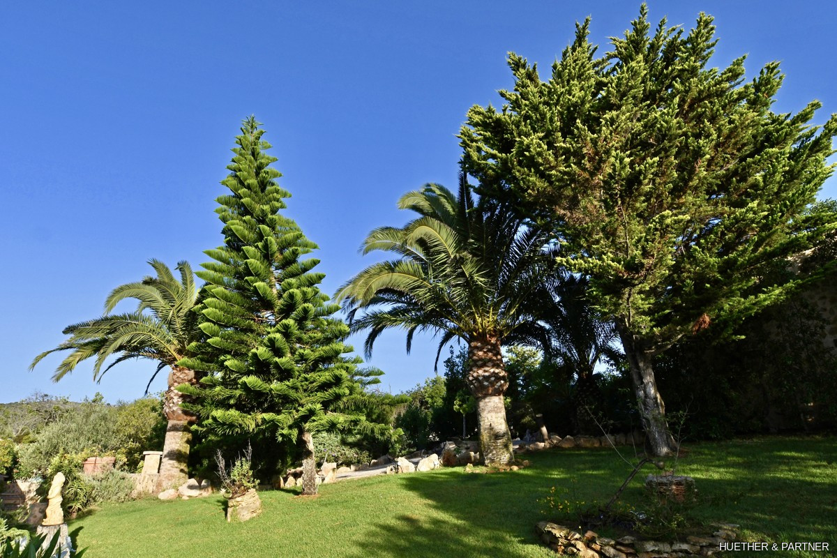 Ein großer mediterraner Garten mit Obstbäumen und automatischer Bewässerung umgibt das Anwesen, das über ein elektrisches Einfahrtstor erreichbar ist. Traditionelle Holzfenster, ein Kamin und eine Ölheizung sorgen für ein gemütliches Ambiente. Die Außenküche mit BBQ und zahlreiche Terrassen laden zum Verweilen ein. Das Grundstück bietet zudem eine Garage und eine von Palmen gesäumte Einfahrt.