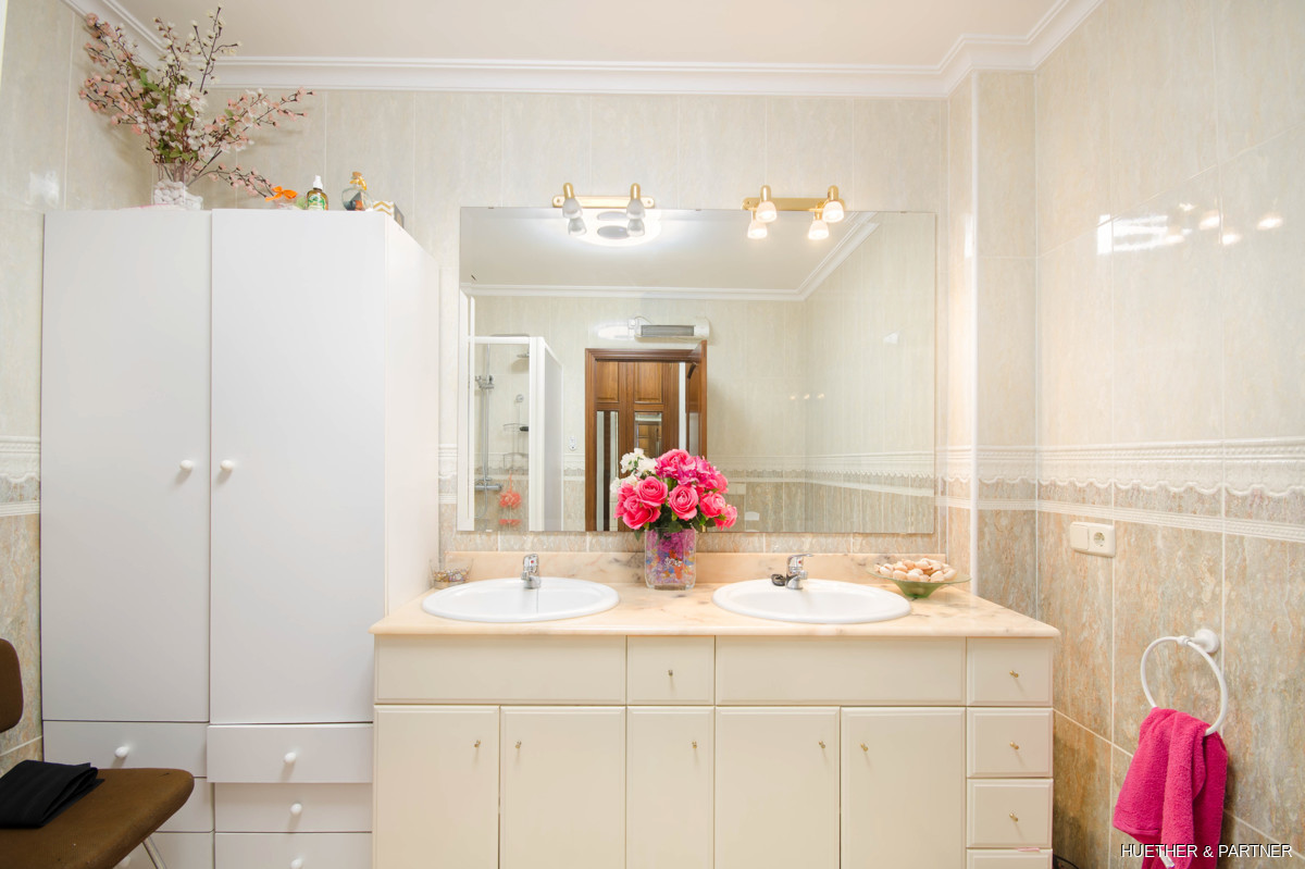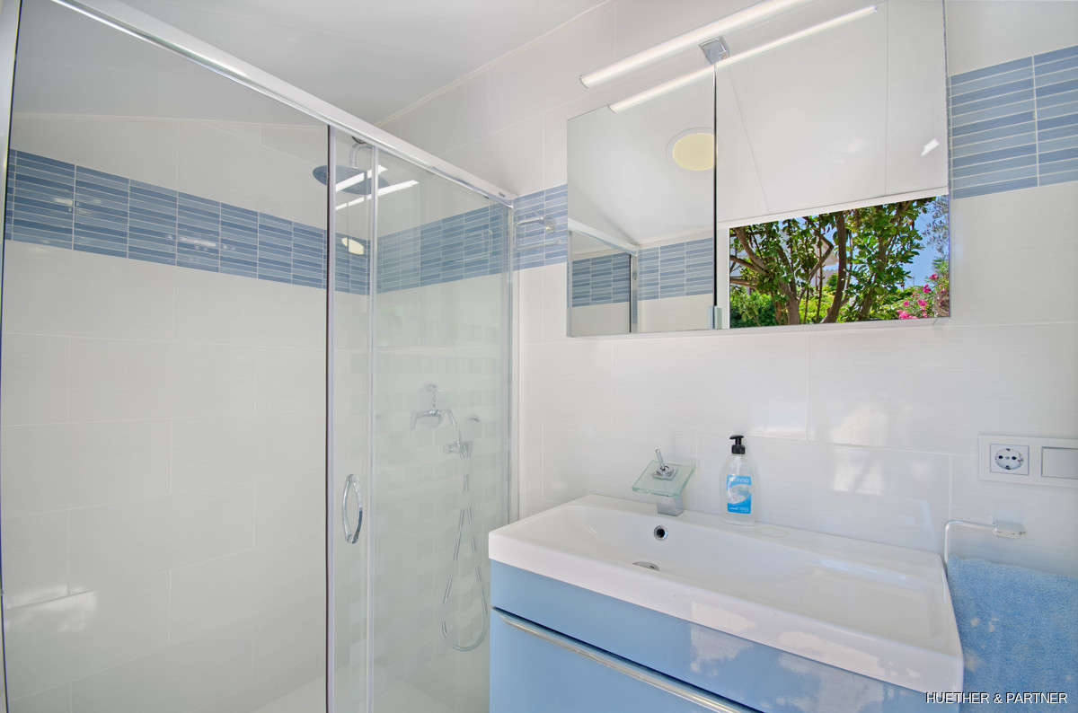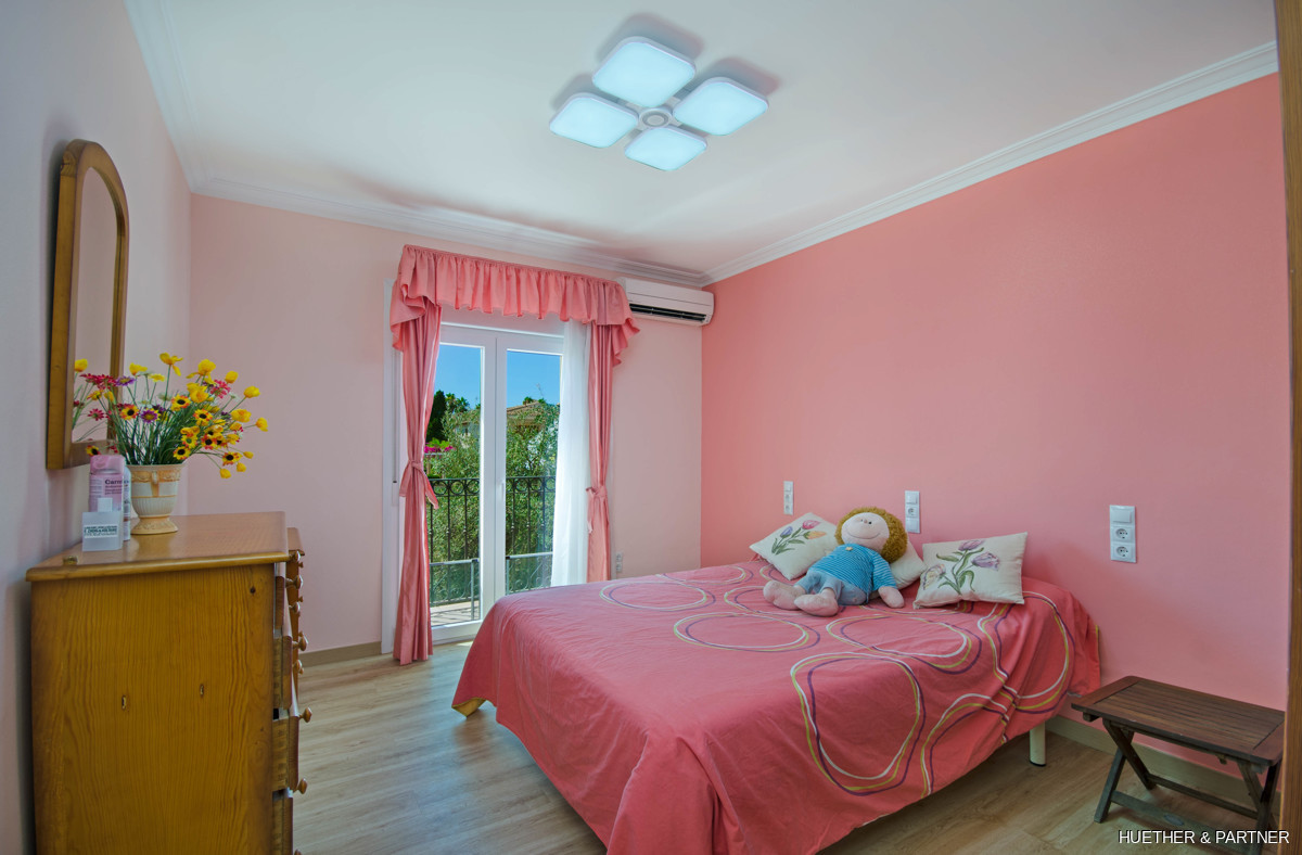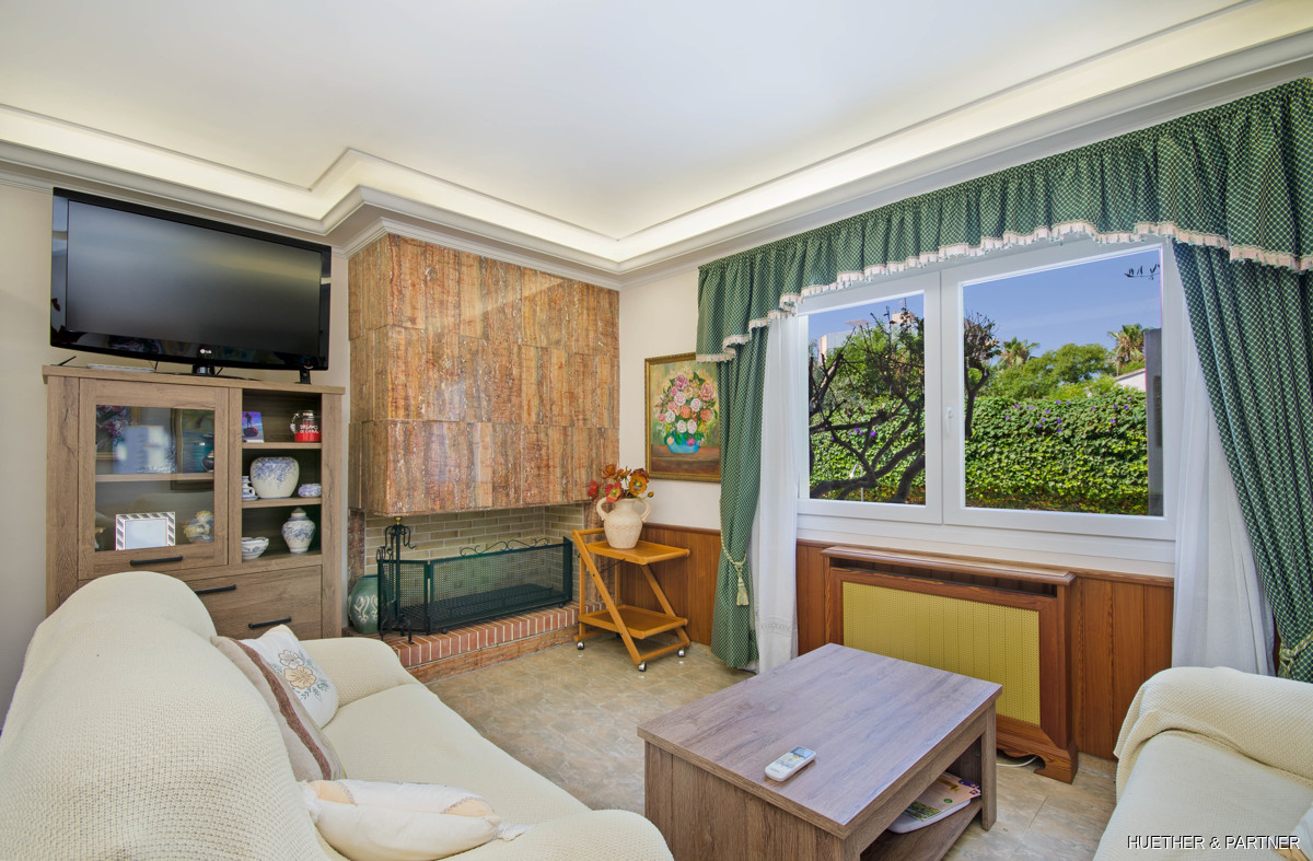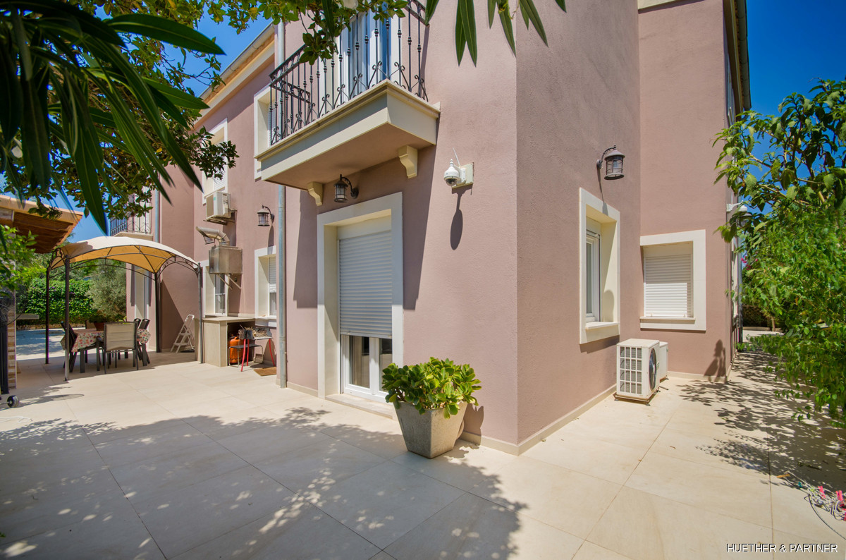 Das Obergeschoss umfasst ein pfirsichfarbenes Hauptschlafzimmer mit Balkon, ein großes Badezimmer sowie weitere Schlafzimmer in verschiedenen Farben. Ein begehbarer Kleiderschrank und eine große Terrasse runden das Angebot ab. Der mediterran bepflanzte Garten und die Doppelgarage mit Technikraum bieten zusätzlichen Komfort.