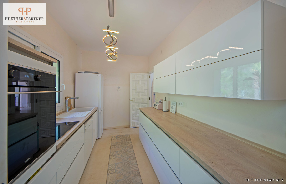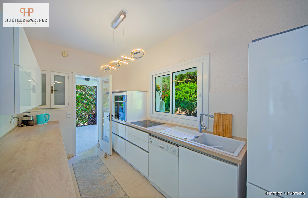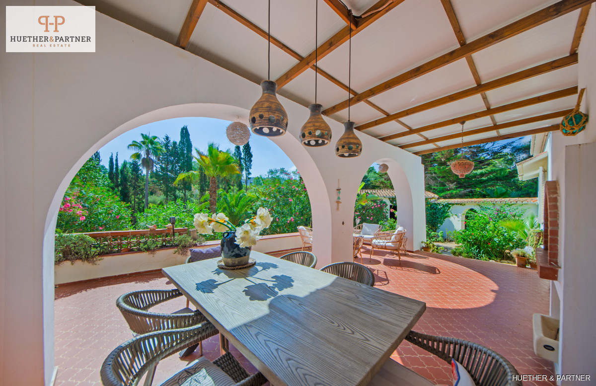 Das Anwesen umfasst zudem überdachte Terrassenflächen, einen dekorativen Außenkamin und einen Teich mit Koi-Karpfen. Die Möglichkeit besteht, den Wohnraum durch eine zusätzliche Wand um ein weiteres Schlafzimmer zu erweitern. Das Grundstück bietet Potenzial für eine bauliche Erweiterung, für die ein Architekt hinzugezogen werden sollte. Die Immobilie wird unmöbliert übergeben.