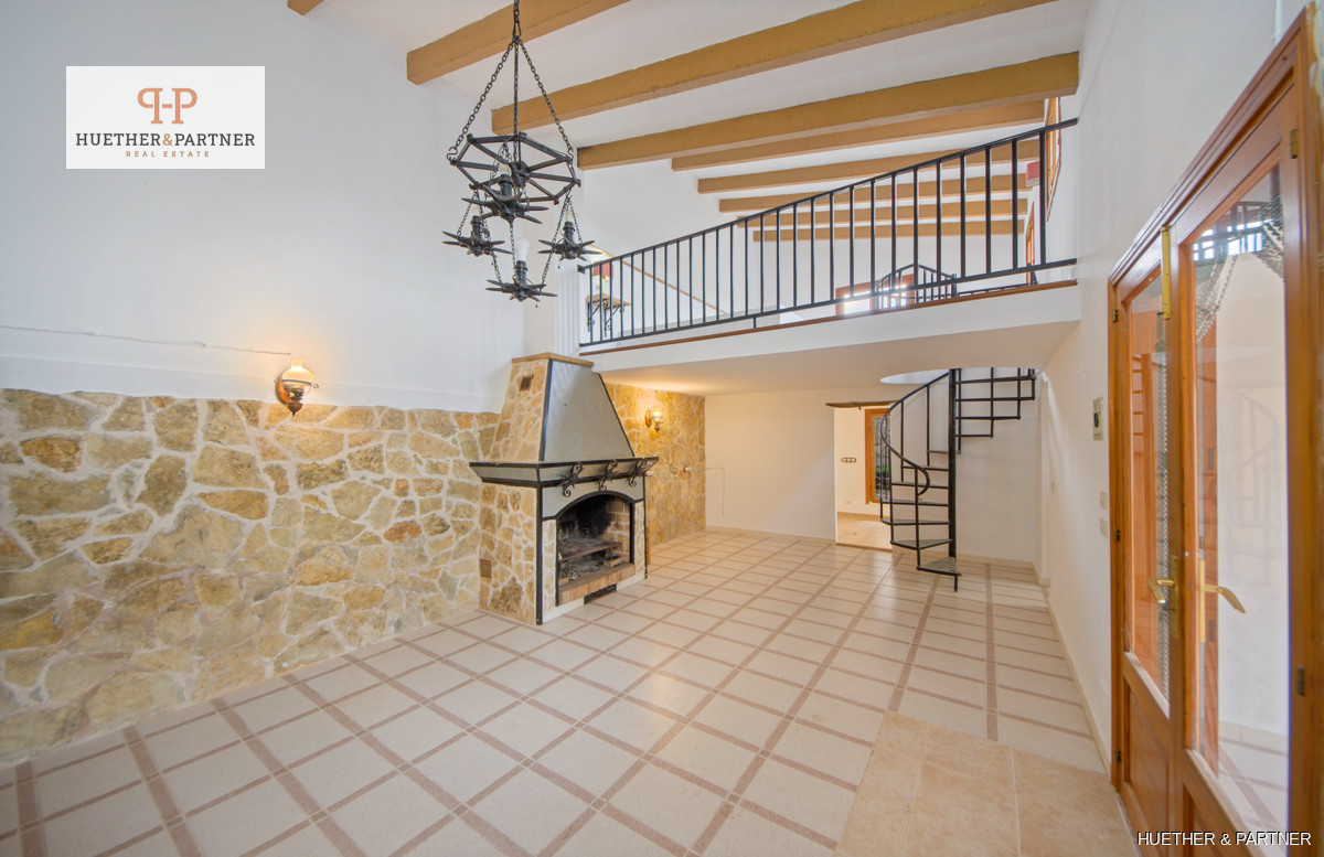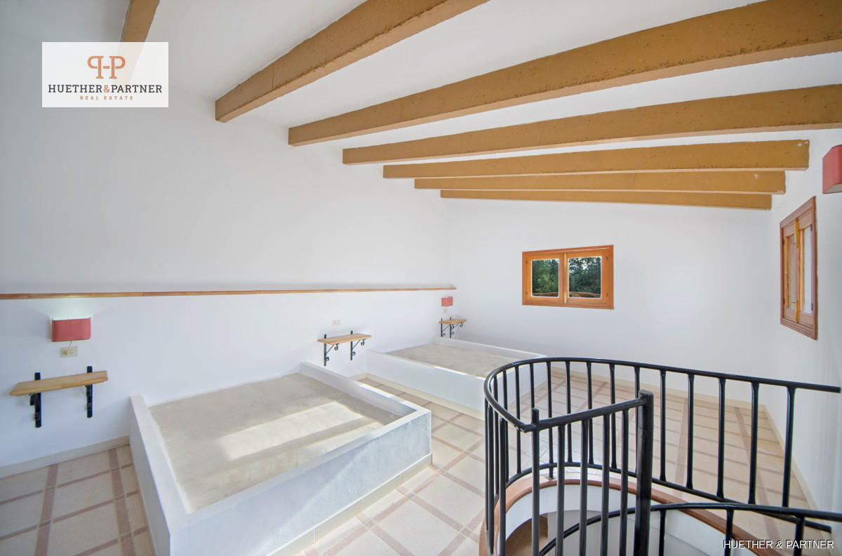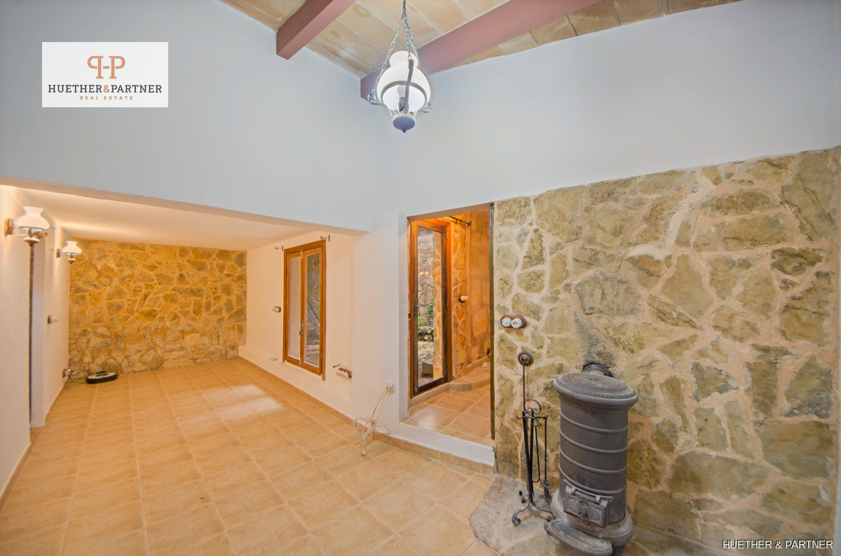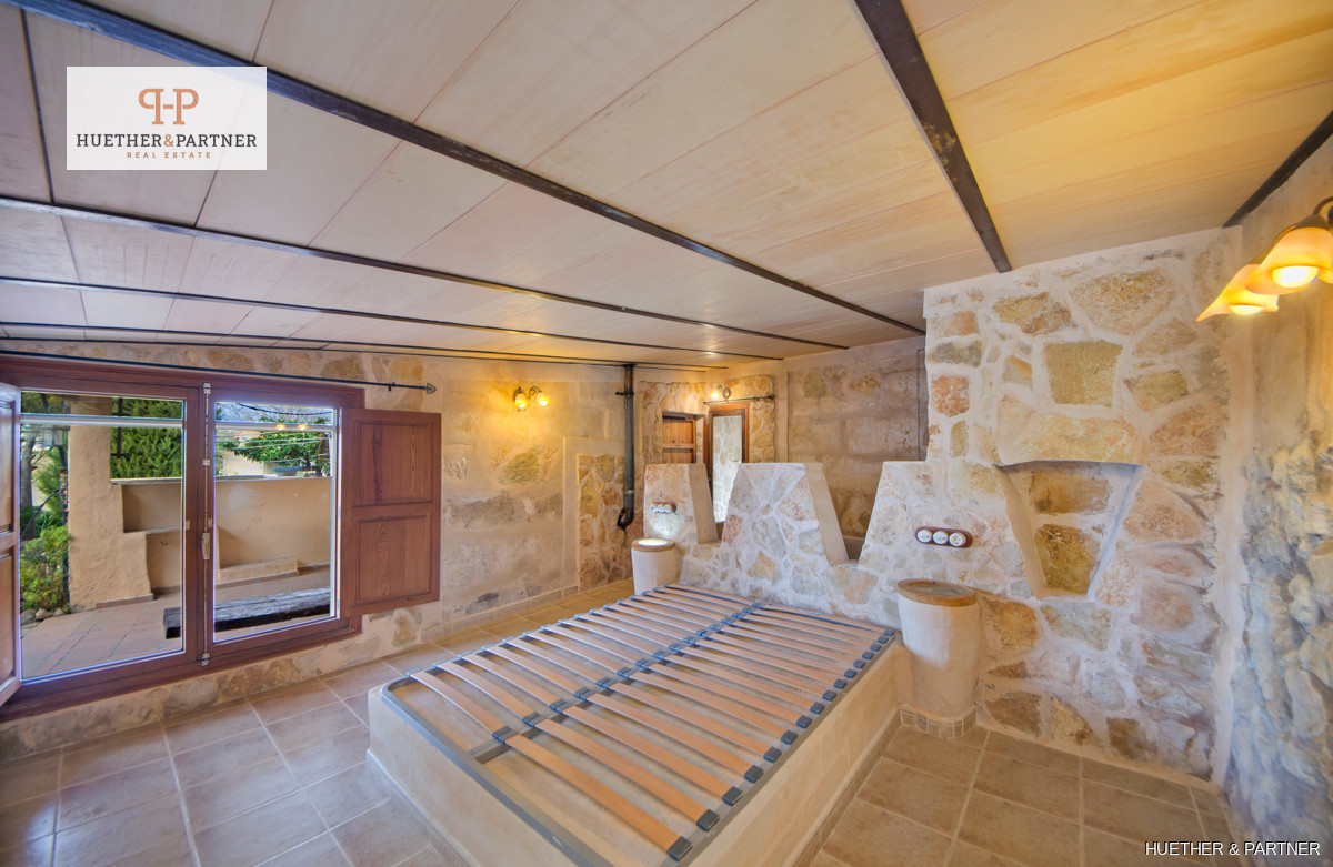 Diese charmante Finca bietet eine Wohnfläche von 106 m² im Erdgeschoss und 24 m² im Obergeschoss mit einer Galerie. Ein großes Wohn-Esszimmer mit offener Küche und offenem Kamin schafft eine gemütliche Atmosphäre. Der angrenzende Raum bietet einen idyllischen Blick auf einen kleinen Brunnen mit Wasserfall und einen Holzofen, dessen Ofenrohr zusätzliche Wärme ins Erdgeschoss liefert. Das Schlafzimmer im Erdgeschoss, früher ein Stall, ist aus mallorquinischem Naturstein gebaut und verleiht der Immobilie rustikalen Charme.