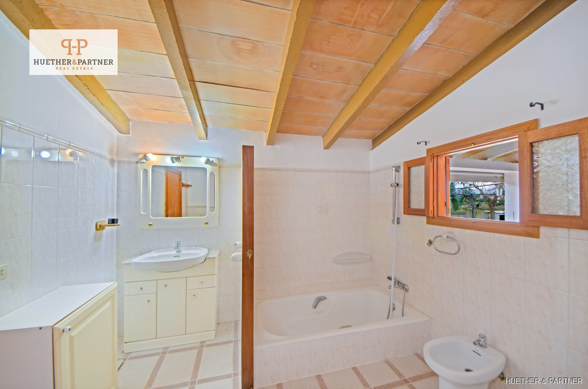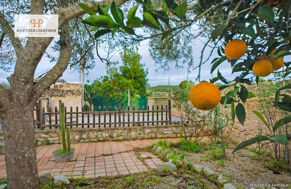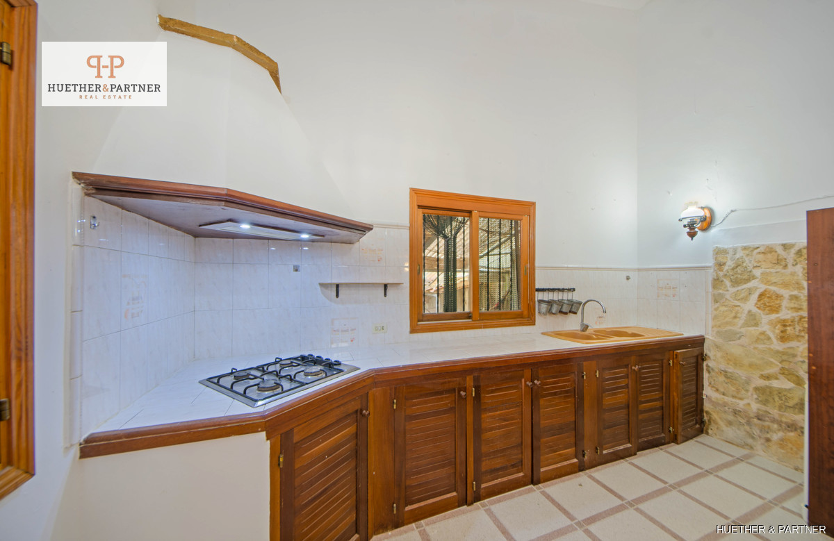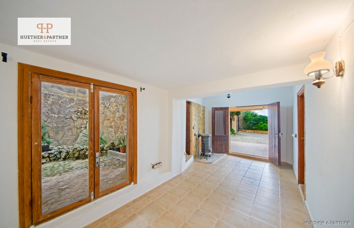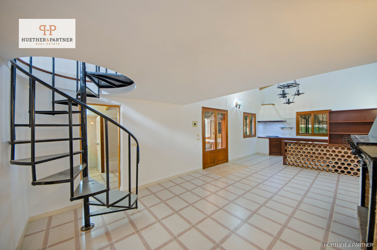 Diese charmante Finca bietet eine Wohnfläche von 106 m² im Erdgeschoss und 24 m² im Obergeschoss mit einer Galerie. Ein großes Wohn-Esszimmer mit offener Küche und offenem Kamin schafft eine gemütliche Atmosphäre. Der angrenzende Raum bietet einen idyllischen Blick auf einen kleinen Brunnen mit Wasserfall und einen Holzofen, dessen Ofenrohr zusätzliche Wärme ins Erdgeschoss liefert. Das Schlafzimmer im Erdgeschoss, früher ein Stall, ist aus mallorquinischem Naturstein gebaut und verleiht der Immobilie rustikalen Charme.